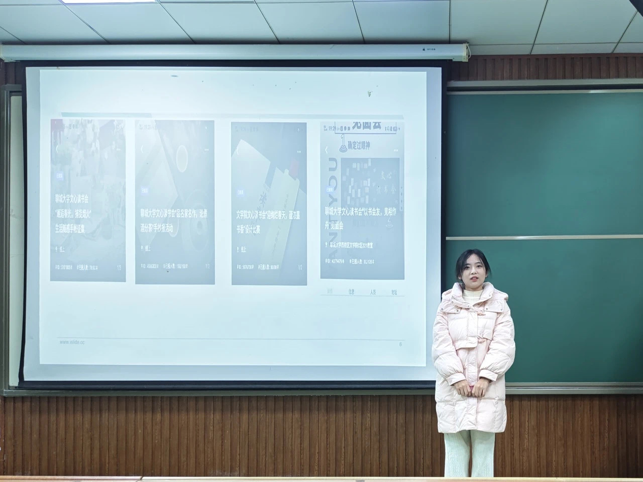 文心读书会副理事长刘祥征与王文炫进行自我介绍,并阐述本次见面会的活动主题和开展流程。刘祥征与王文炫对新会员表示热烈欢迎后,本次见面会正式拉开帷幕。王文炫为新会员发放书签等见面礼,以表深切关怀和殷殷期盼,希望新会员领会阅读魅力,充盈精神世界。每位新会员依次上台领取见面礼并做自我介绍和好书分享,台下响起阵阵掌声,现场氛围达到高潮。随后,主讲人播放精心剪辑的社团发展纪录片向新会员展示社团基本面貌,并借助幻灯片介绍社团历年活动以及所获荣誉,阐明社团成立宗旨和未来规划。在答疑环节中,主讲人对新会员所提疑问进行现场解答,帮助新会员进一步了解社团。最后,见面会成员集体进行合影留念,主讲人宣布本次见面会正式结束。
