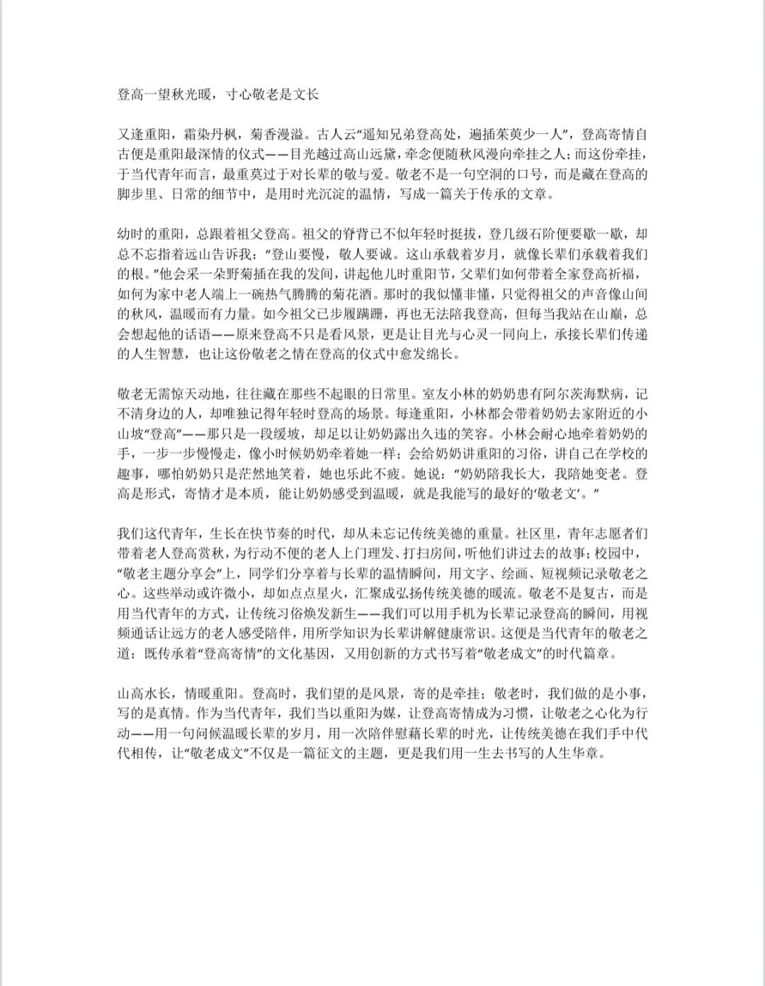 纸承登高怀,文载敬老情。本次征文活动不仅是文学创作的实践,更是一堂生动的传统文化育人课。学子们在书写与思考中,不仅加深了对重阳节俗的理解,更在情感上建立起与传统文化的深层联结。未来,学院将继续以传统节日为纽带,引导学生在参与中涵养家国情怀,在传承中积蓄精神力量。(通讯员 陈祥莹 于子琦 王艳晗 周思含 审核 柳浩雨 孙淑贤 徐一凡)