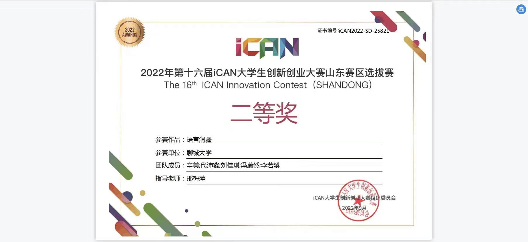我院代沛鑫同学荣获第十六届iCAN大学生创新创业大赛山东赛区选拔赛二等奖。此次获奖充分展现了代沛鑫同学在日常学习生活中的不懈努力,我校为有这样的学生而感到骄傲。在此,向代沛鑫同学表示诚挚的祝贺,同时祝愿他乘风破浪,再获佳绩。