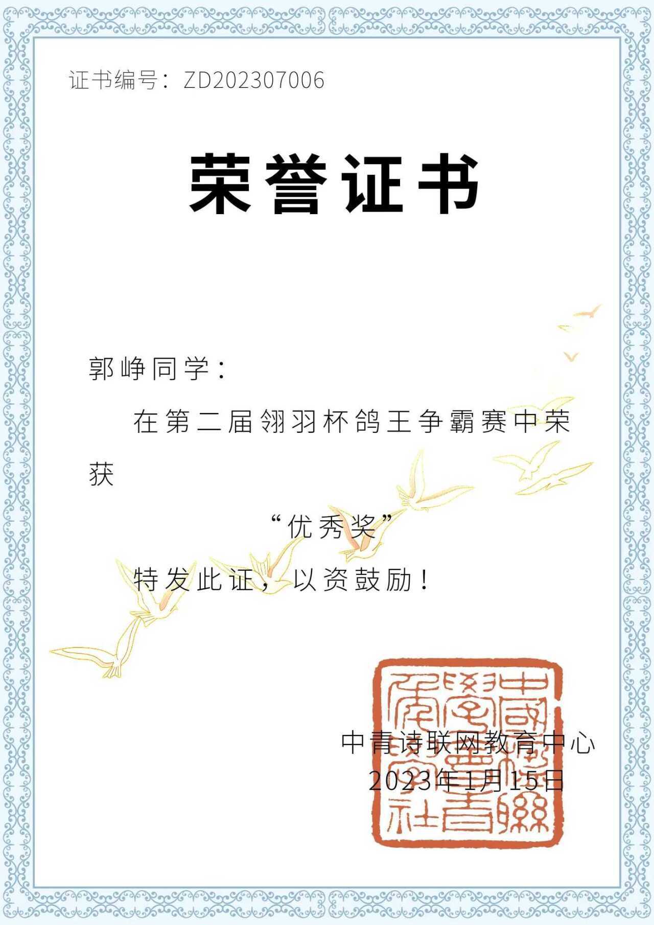 热烈祝贺suncitygroup太阳集团郭峥同学荣获第二届“翎羽杯”鸽王争霸赛优秀奖
