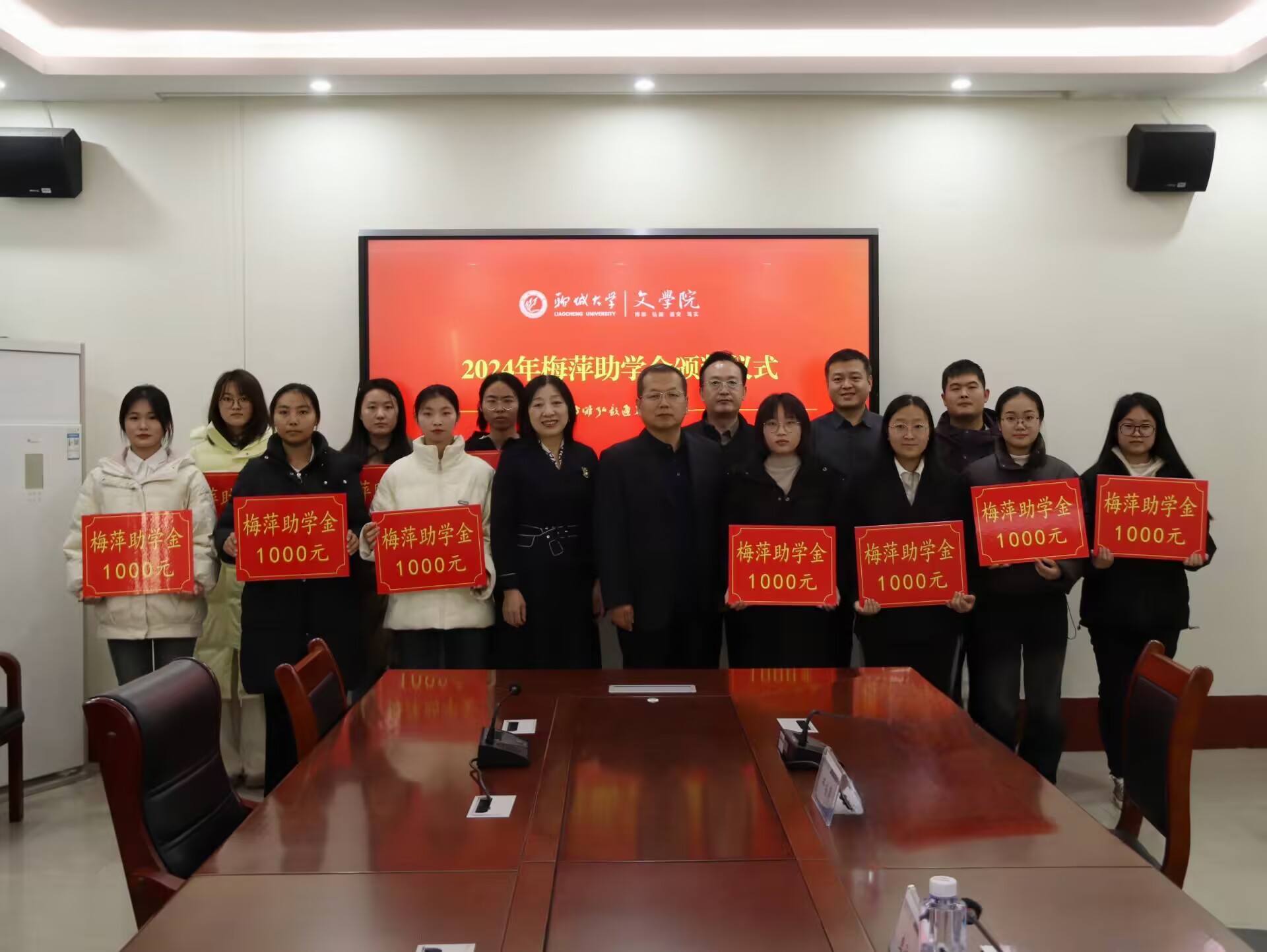 “梅萍助学金”是由suncitygroup太阳集团邢梅萍老师于2016年设立的助学金项目,主要用于资助孤儿、单亲等特殊类家庭经济困难学生,帮助他们顺利完成学业,实现身心健康发展。颁奖仪式上,李承虎代表学院致欢迎辞,他对在场师生表示亲切问候,对邢梅萍老师和受助学生分别表示感谢和祝福。李承虎强调,“梅萍助学金”不仅是一种经济上的资助,更是一种精神上的激励,受助学生应以此次颁奖仪式为契机,锤炼良好品德修养,提升综合素质与能力水平,以实际行动回馈社会、报效祖国,争做有担当、有作为的新时代好青年。随后,于东恩宣读受助学生名单,邢梅萍为受助学生颁奖。受助学生代表邢淑敏深情分享自己的成长故事,并向邢梅萍老师致以真挚的感谢,“邢梅萍老师在普通话课上对我的悉心教导,改善了我的普通话水平,也帮助我树立了信心,让我不再羞于在人群之中开口说话。”她呼吁同学们要不惧苦难失意,努力战胜困境,将所学运用于所行,努力突破自身局限,迎接人生璀璨曙光。邢梅萍用自身的成长经历温情勉励受助学生永葆学习热忱和奋进姿态,为实现人生理想而努力奋斗,为国家和社会发展贡献力量,将殷殷关爱化作砥砺前行的不竭动力,让爱心和温暖不断延续。最后,全体参会人员合影留念。
